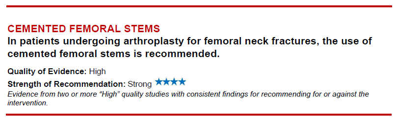 "Strong evidence supports the use of cemented femoral stems for patients undergoing arthroplasty for hip fractures."